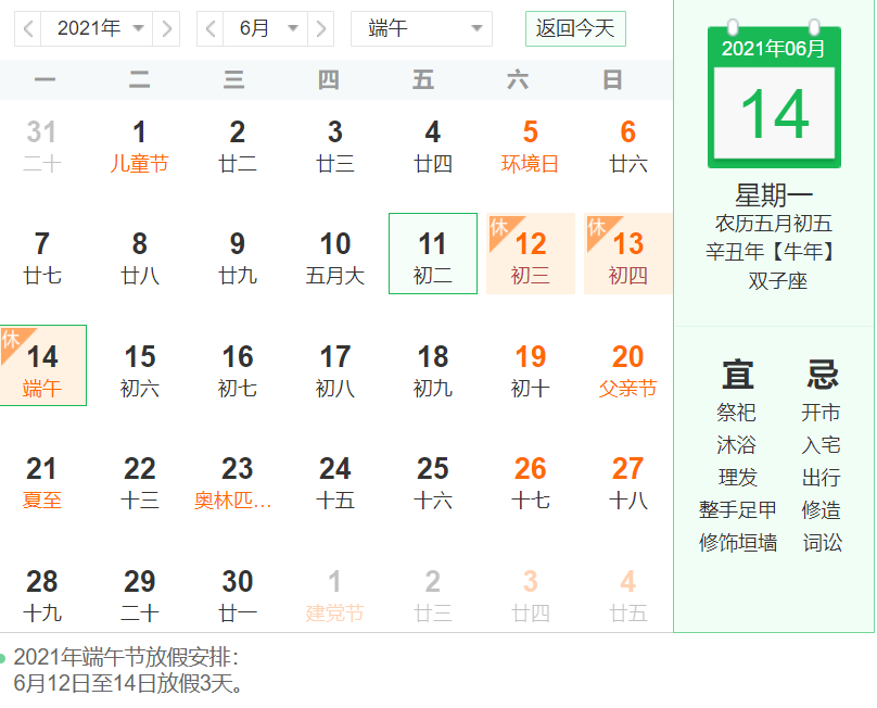 放假時間:2021年6月12日--2021年6月14日
